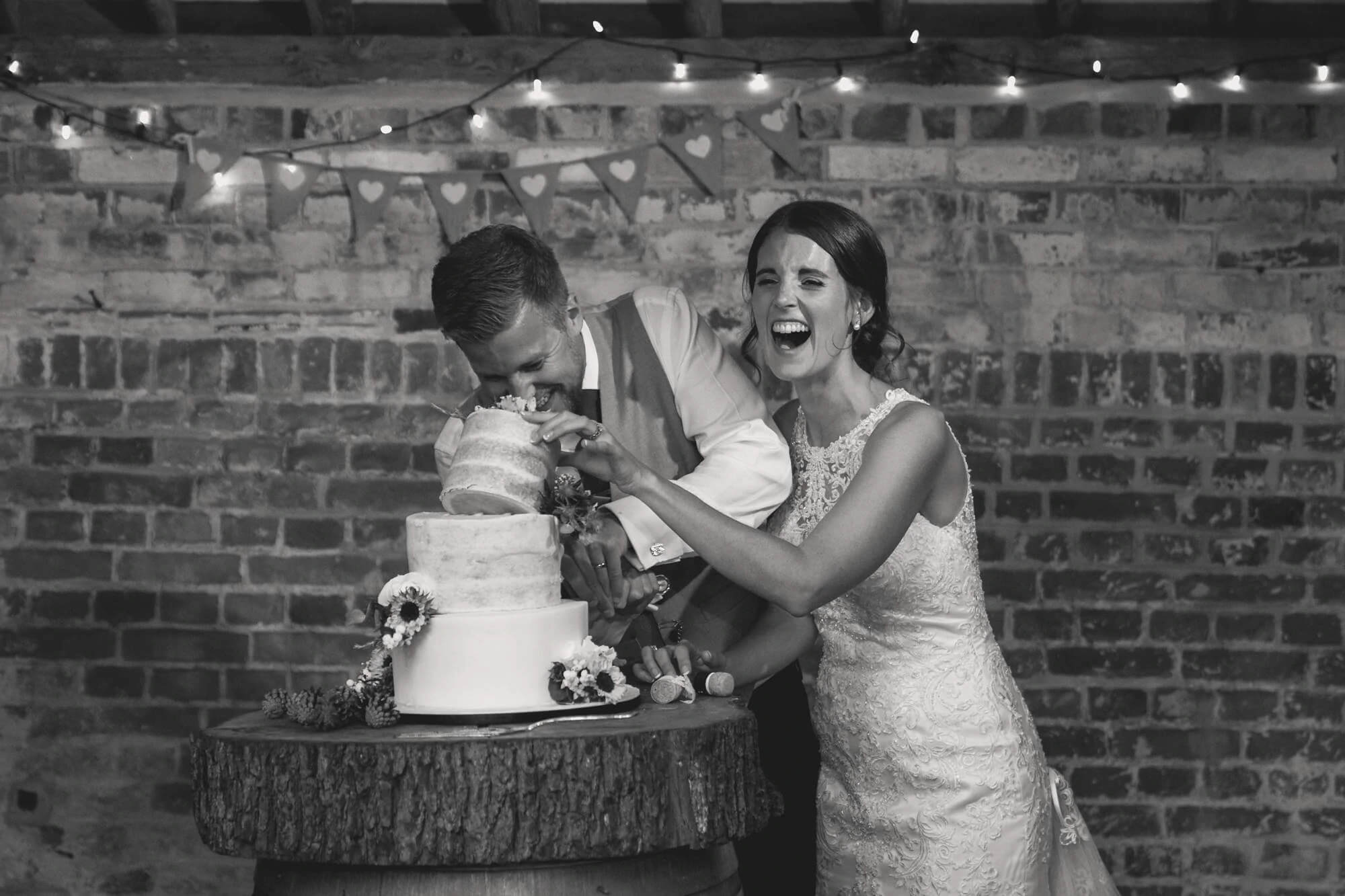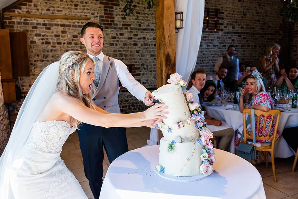 “Their cake had been made by a friend and set up at Upwaltham Barns ready for the cake cutting later in the day. During the meal myself and the videographer were rushed into the barn as the cake had got so warm that it was about to collapse. I have a whole sequence of them cutting their fast collapsing cake but this is the final frame before the catering staff had to rush in and catch it as it collapsed in a heap. “